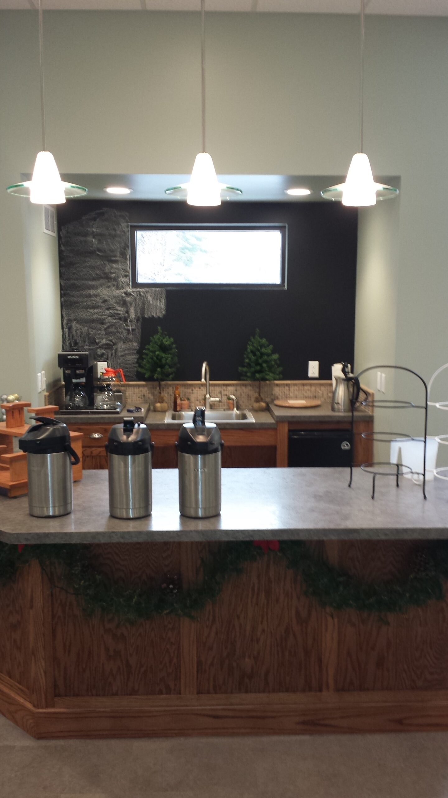 Interior: Fellowship hall, large restrooms, coffee bar, acoustical ceiling clouds, custom millwork
