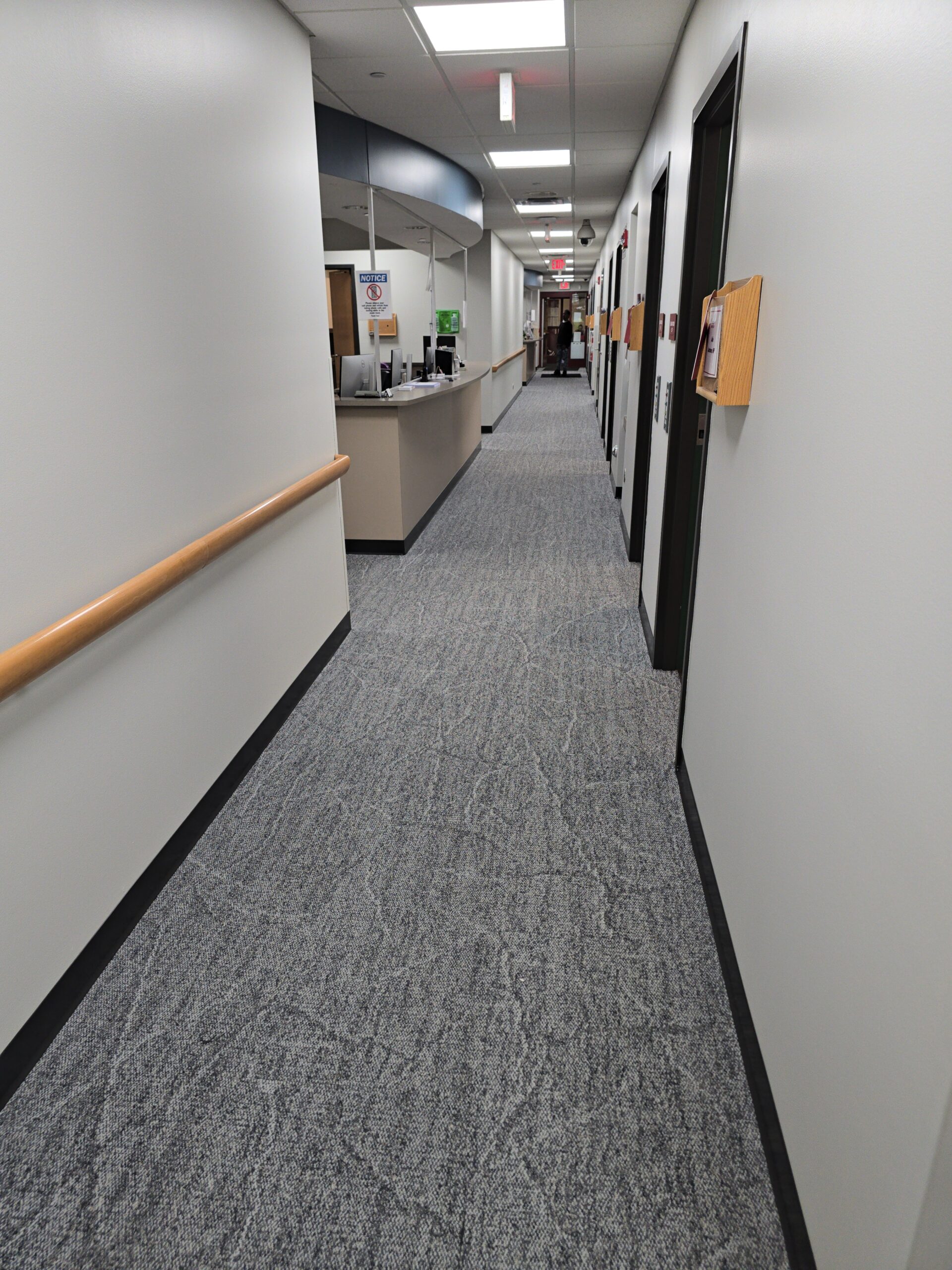 Scope: Installed new LVT, carpet, porcelain and vinyl cove base throughout, painted all walls, doors and frames, replaced 270 lights with LED flat panels, lifted a highly sensitive and precision drug dispensing machine to replace flooring, constructed new walls to create privacy, installed new automatic sliding glass doors on interior entrance, upgraded the front desk area and removed and re-poured new concrete sidewalk.